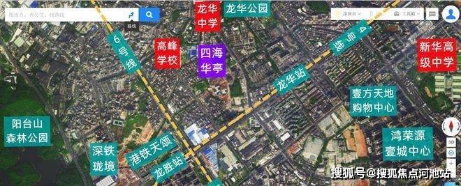 华侨城四海华亭,位于龙华区大浪街道龙胜路与春华路交汇处东侧,由华侨城集团开发,项目毗邻高峰学校,周边多为城中村,城市面貌稍差,不过基本都已经划入城市更新单元,东南侧约1.2公里是龙华最大的壹方天地购物中心,4号地铁线“龙华站”,“龙胜站”距离都在800米范围内,6号地铁线“上芬站”距离约1.4公里。