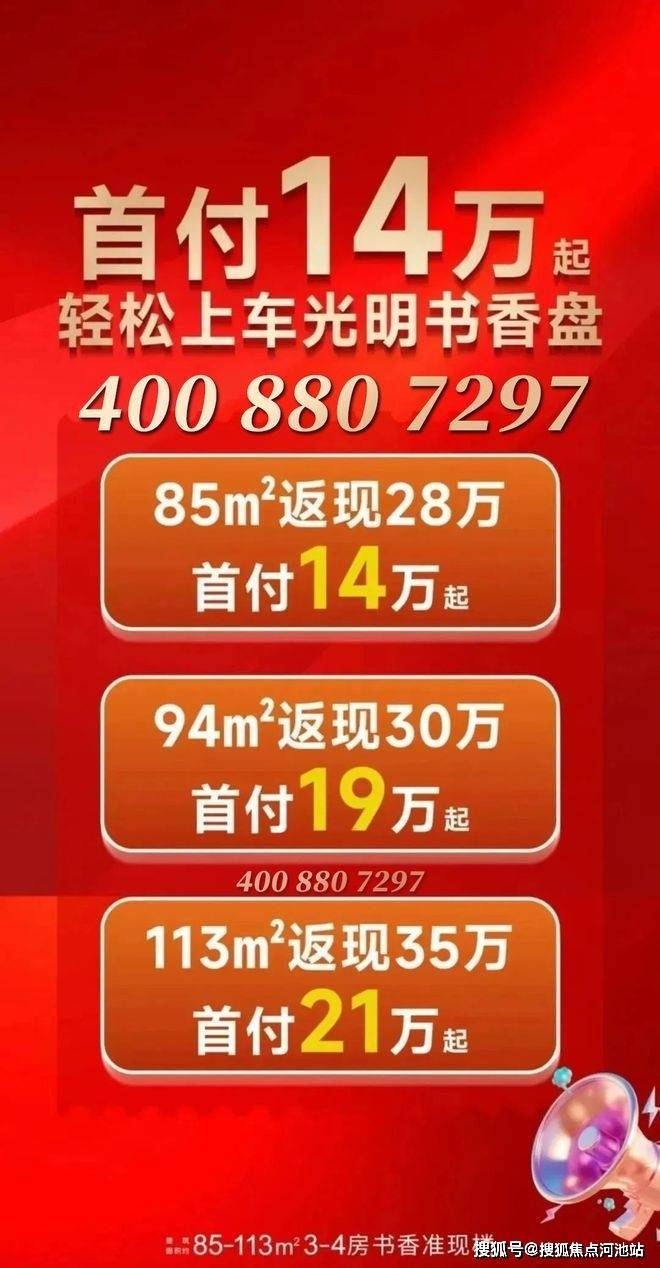 优惠方案后:85-94㎡3房首付仅12.8万起,113㎡4房首付20.8万起,开盘期间还有额外大礼包优惠!具体情况到现场了解!
