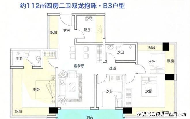 112㎡的4房2厅2卫(B3户型),设计的是竖厅双龙抱珠格局,进门独立入户玄关,餐客厅一体化设计,四开间朝南,全屋八面飘窗,主卧+1个次卧270°无柱转角飘窗,U型厨房,卫生间干湿分离,得房率约100%(包含赠送),客厅连接次卧出大阳台西南朝向。