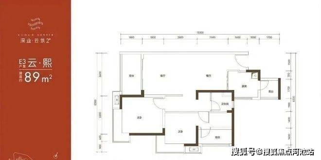89㎡的3房2厅1卫,E2户型,设计的是竖厅格局,客厅3.6米开间,LDKB一体化设计,3个卧室分别做到了主卧13.5㎡/次卧9.54㎡/次卧8.1㎡(含墙体飘窗),L型厨房还带1个小生活阳台,卫生间三段式分离,得房率:79.89%(不含赠送),东南/西南或正南朝向。