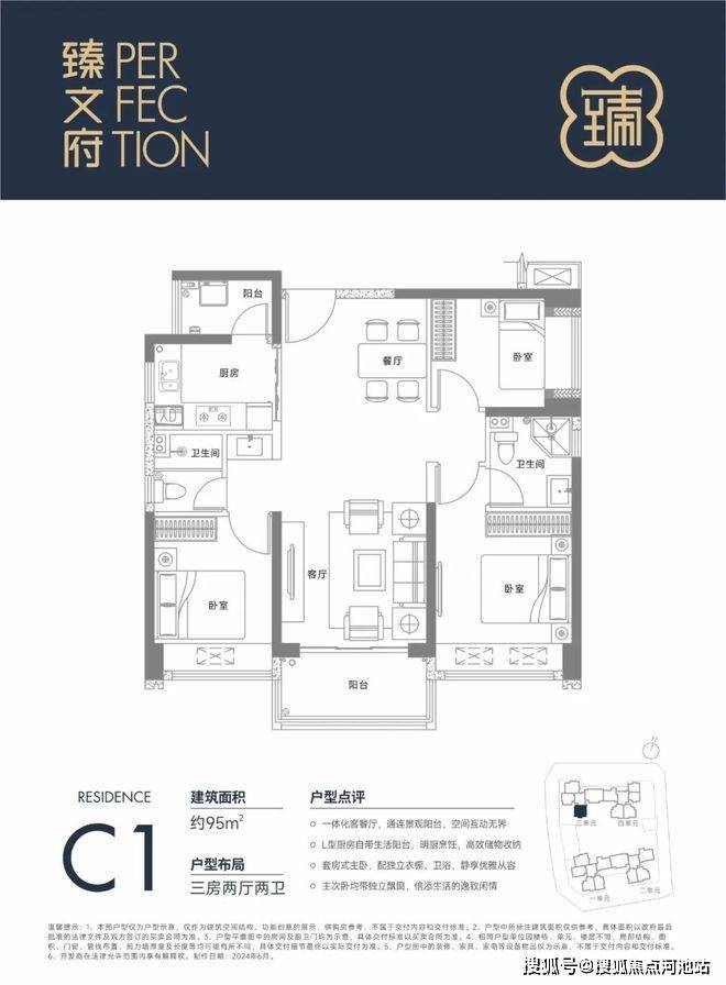 95㎡的3房2厅2卫,设计的是双龙抱珠格局,客厅3.4米开间,一体化客餐厅,三开间朝南,L型厨房还带1个小生活阳台,公卫三段式分离设计,得房率约85%(包含赠送),阳台朝东南或西北向。