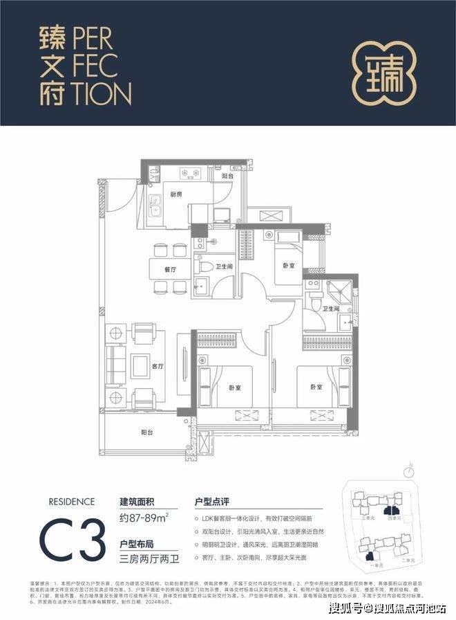 87㎡的3房2厅2卫,设计的是经典竖厅格局,进门入户玄关,LDKB一体化设计,三开间朝南,L型厨房还带1个小生活阳台,卫生间干湿分离,得房率约85%(包含赠送),阳台朝东南向。