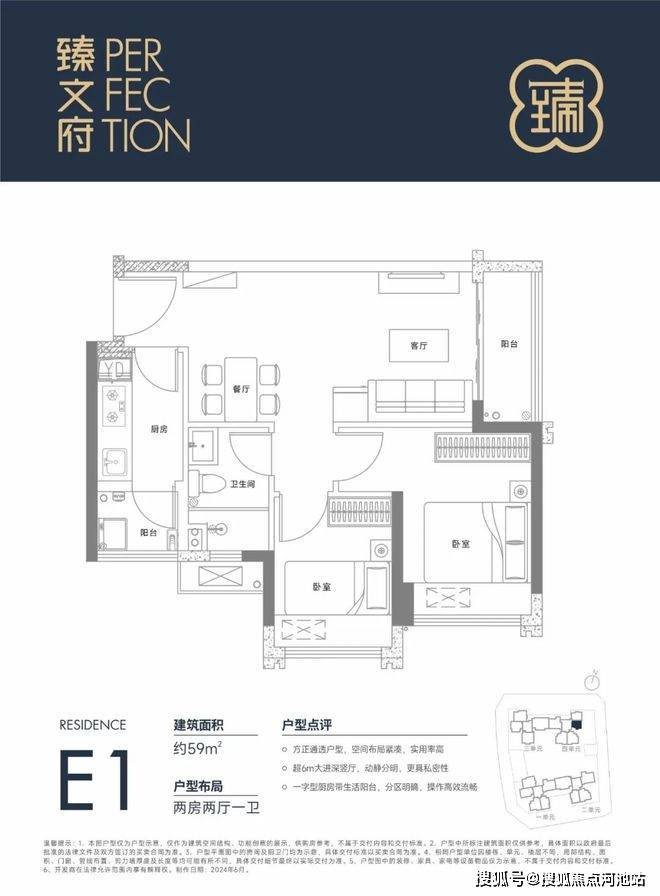 59㎡的2房2厅1卫,设计的是竖厅格局,客厅2.95米开间,超6米进深客厅,一字型厨房还带1个小生活阳台,卫生间干湿分离,得房率约85%(包含赠送),阳台朝东北向。