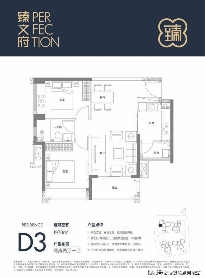 78㎡的2房2厅1卫,设计的是竖厅格局,进门入户玄关,客厅3.4米开间,三开间朝南,L型厨房还带1个小生活阳台,卫生间干湿分离,得房率约85%(包含赠送),阳台朝东南向。