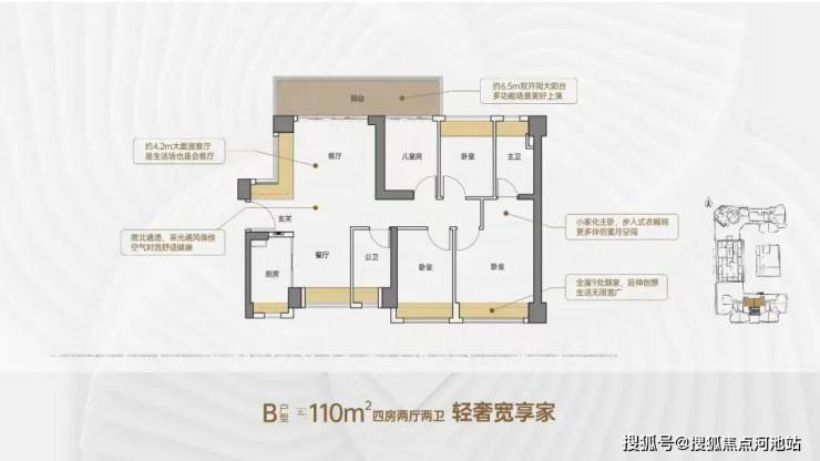 110㎡的4房2厅2卫,设计的是竖厅南北通透格局,客厅4.2米开间,进门户玄关,客厅连接次卧出6.5米长的大阳台,主卧大套间设计,全屋9处飘窗,U型厨房,卫生间干湿分离,阳台主朝北向。