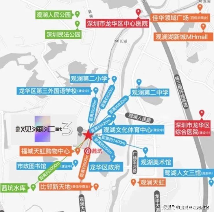 观澜汇与龙华区府仅一路之隔,项目三期过去的直线距离仅约400米(根据百度测距,仅供参考)。