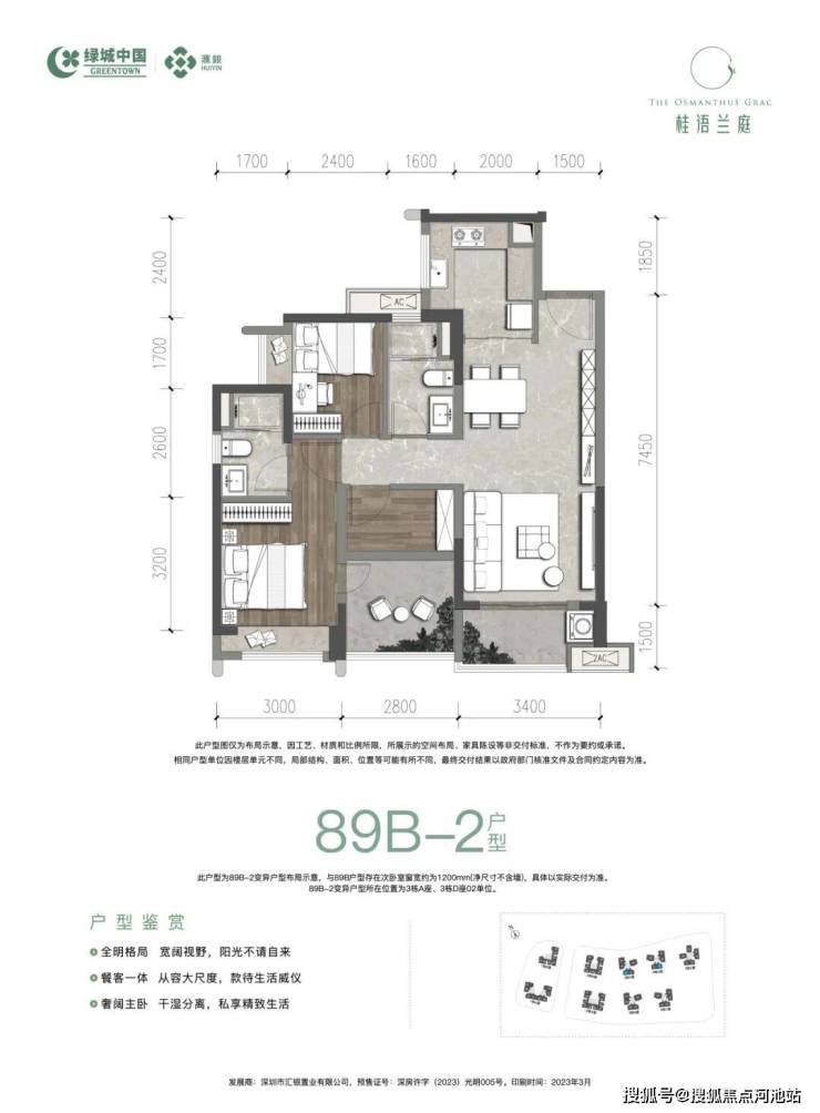一期89㎡的3房2厅2卫(A-2户型),3栋B/C座01.02户型,竖厅格局,客厅3.4米开间,LDKB一体化设计,三开间朝南,动静分区,U型厨房,卫生间干湿分离,阳台约5㎡。西南朝向,得房率:75.2%(不含赠送)加上赠送后得房率约84.78%。