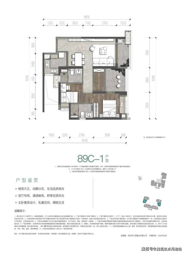 一期89㎡的3房2厅2卫(B-1户型),3栋A/D座03户型,竖厅格局,客厅3.4米开间,LDKB一体化设计,三开间朝南,动静分区,U型厨房,卫生间干湿分离,阳台约5㎡。西北或东南朝向,得房率:78.8%(不含赠送)加上赠送后得房率约89%。