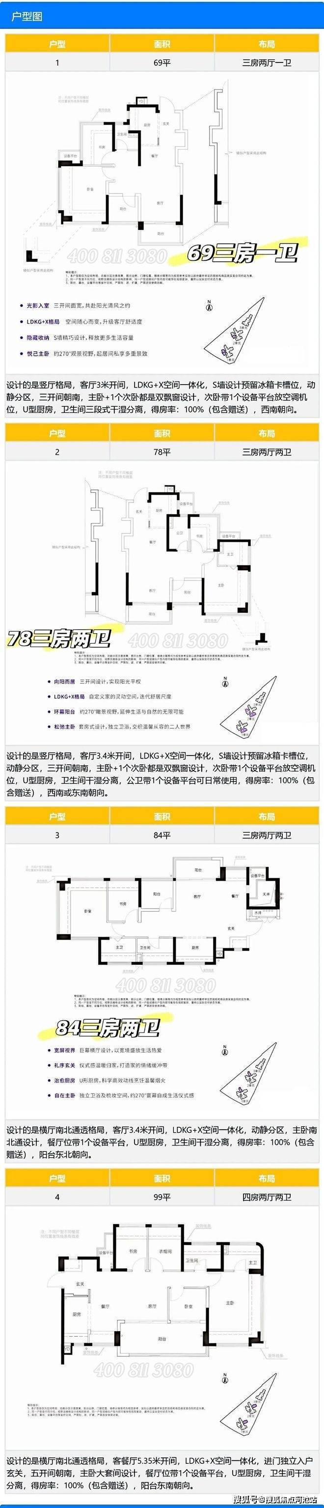 4、新规建筑,使用率较高,69㎡可以做到三房,79-82㎡做到三房两卫,99㎡做到四房;