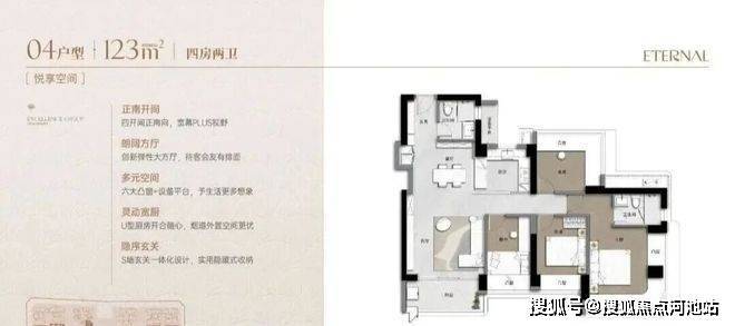123m²的4房2厅2卫,设计的是经典竖厅格局,客厅4.2米开间,LDKB一体化弹性大方厅,S墙设计预留冰箱卡槽位,四开间朝南,动静分区,主卧套房270°环幕凸窗,六大凸窗+设备平台,分别做到了主卧20.36㎡/次卧10.14㎡/次卧10.04㎡/次卧8.14㎡(实测面积,去掉墙体),U型厨房,卫生间干湿分离,得房率超90%(包含赠送),正南朝向,看皇岗公园。