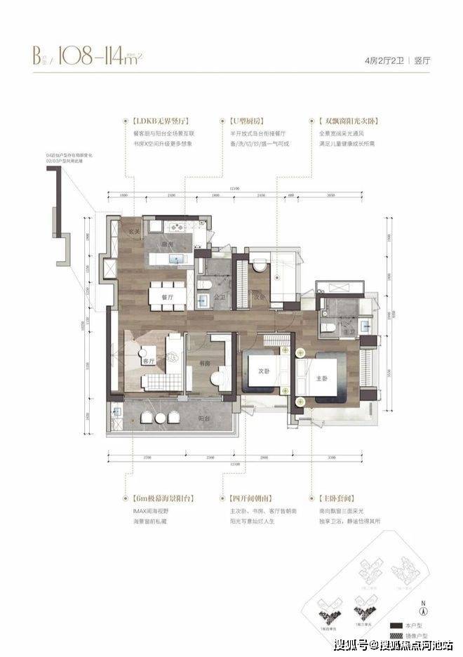 户型方面,臻藏级南向湾海视野,LDKB人性化动线设计,格局方正、高实用率,打造独立玄关、双飘窗主卧、步入式衣帽间等个性化空间。