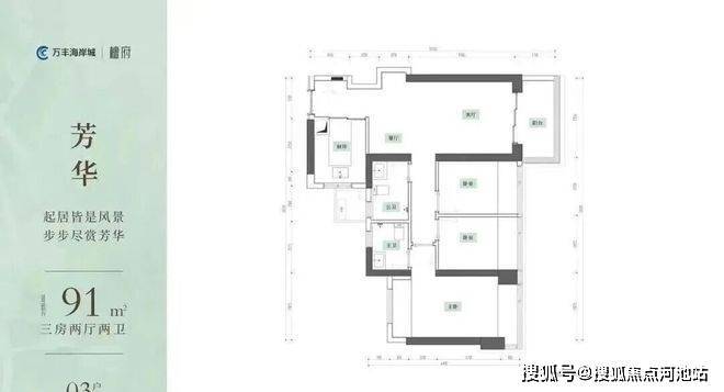 91㎡的3房2厅2卫,设计的是竖厅格局,客厅3.35米开间,LDKB一体化,S墙设计预留冰箱卡槽位,动静分区,U型厨房,公卫干湿分离,得房率约94%(包含赠送),阳台5.7m²东北朝向。赠送面积约11.27m²。