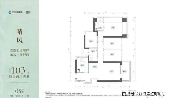 103㎡的4房2厅2卫,设计的是竖厅格局,客厅3.65米开间,LDKB一体化,S墙设计预留冰箱卡槽位,动静分区,U型厨房,公卫干湿分离,得房率约99%(包含赠送),阳台6.2m²东北朝向。赠送面积约17.28m²。