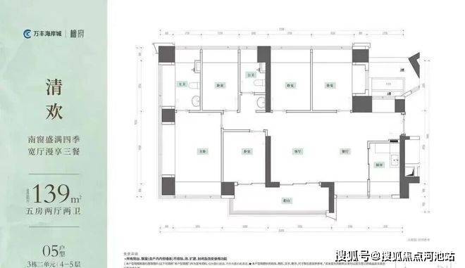 139㎡的5房2厅2卫,设计的是横厅南北通透格局,客餐厅6.25米开间,LDKB一体化,全屋12面飘窗,U型厨房,公卫三段式干湿分离,得房率约100%(包含赠送),客厅连接次卧出6.8米长的观景大阳台约11.9m²东南朝向。赠送面积约29.47m²。