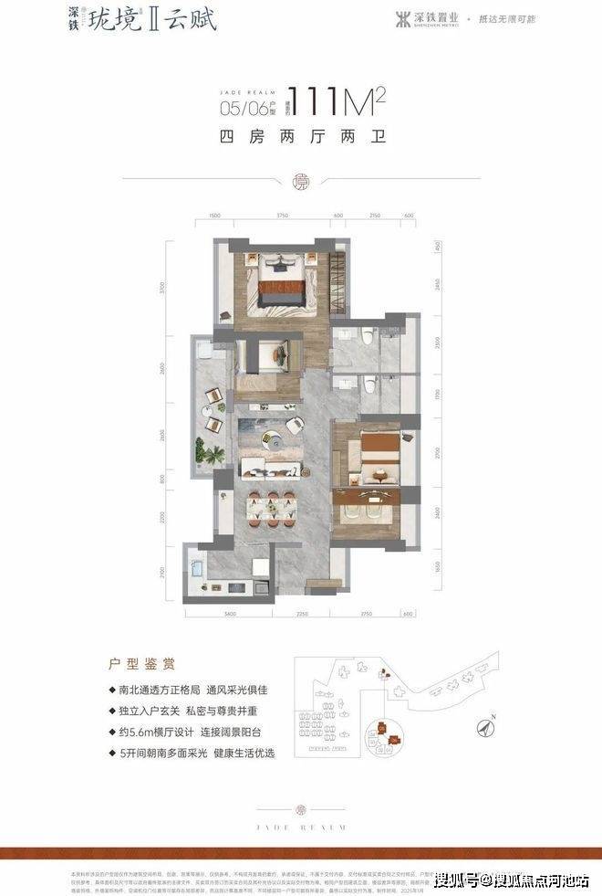 111㎡的4房2厅2卫,设计的是横厅南北通透格局,进门入户玄关,客餐厅5.6米开间,LDKB一体化设计,五开间朝南,客厅连接次卧出6.15米长的大阳台,U型厨房,卫生间干湿分离,得房率约75.4%(不含赠送),阳台主朝东南或西南向,其中西南朝向可以看阳台山景。