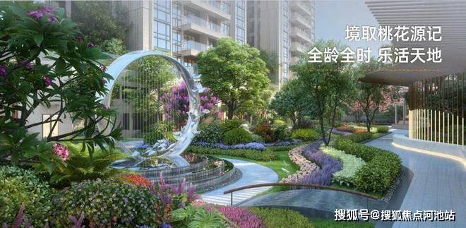 全龄全时 乐活天地:以桃花源记为园境蓝本,以闹市-叩山-寻幽-觅趣-入谷为景观流线,营造世外桃源式的入谷寻幽意境,于城市喧闹中自有一番雅园静谧。更以多元生活场景嵌入社区景观中,沿阶花池、雕塑水景、休闲长廊、屋顶花园,并打造专属儿童天地,打造全龄段的家庭乐活天地。