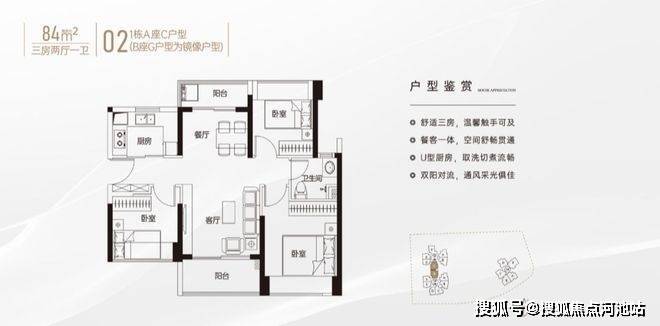 84㎡的3房2厅1卫,1栋A座C户型/1栋B座G户型,设计的是竖厅南北通透格局,客厅3.4米开间,客餐厅双阳台分离化设计,U型厨房,卫生间干湿分离,得房率约74%(不含赠送),客厅阳台主朝东北向。
