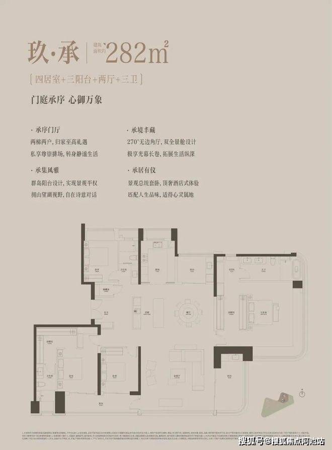 282㎡四房三卫,折后总价区间1448-1861万,单价区间5.14-6.60万/㎡;