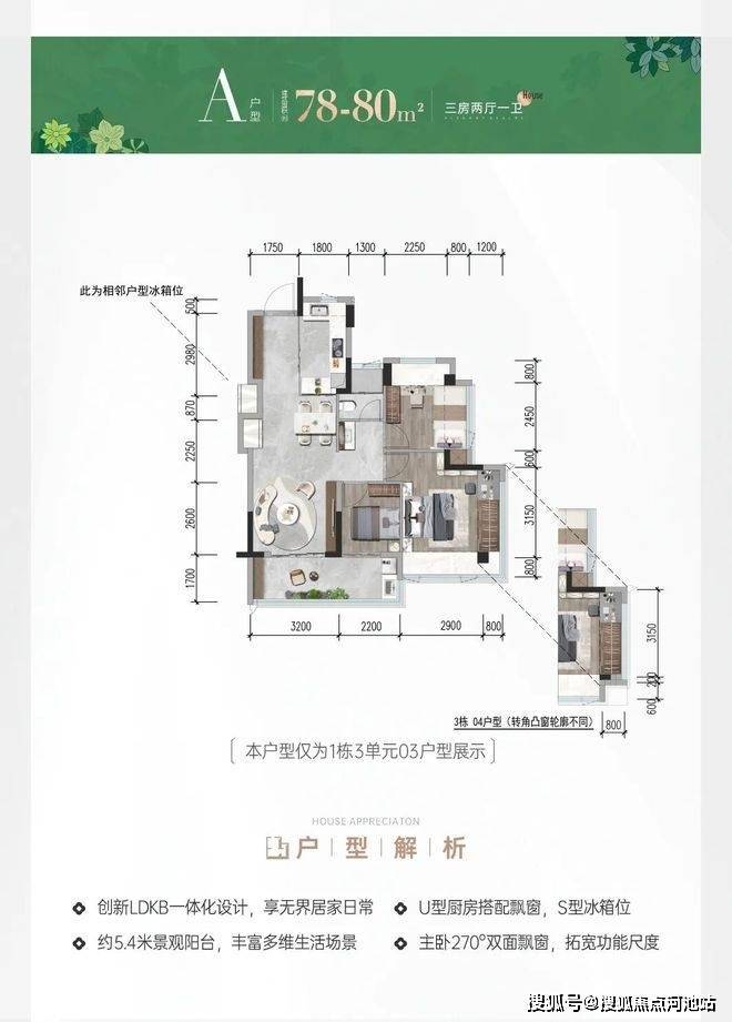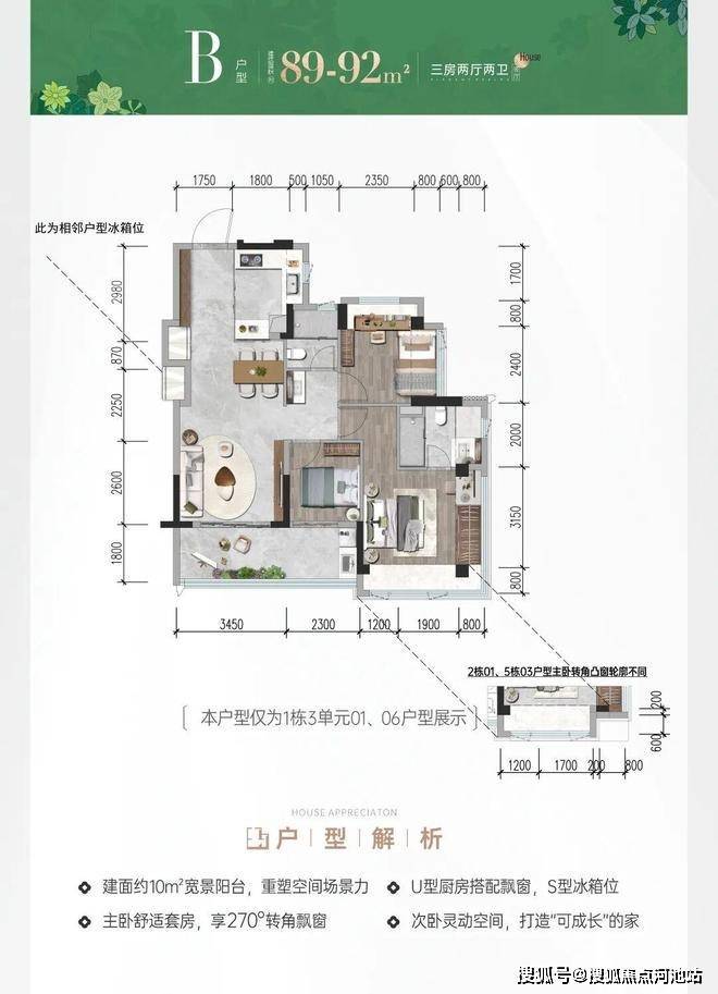 前海会展首发建面约78-117㎡三四房新规作品,户型拓展后实际使用率最高可达105%;主、次卧270°转角双飘窗(建面约117m次卧除外);建面约9-13㎡新规宽景阳台重构居住想象