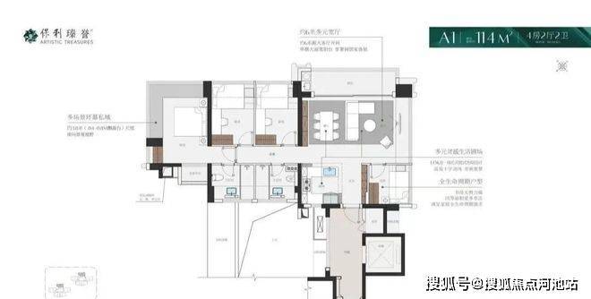 纯改善四房产品,得房率超100%。臻誉府定位高端,纯四房设计,户型面积114-143平,圈层纯粹,适合改善客户。