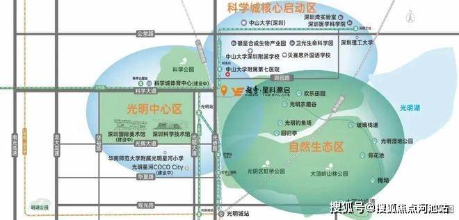 位于光明科学城核心区云谷板块,北临中山大学深圳校区人文高地,南接光明城新兴板块,西靠光明中心成熟生活圈。四公园环绕(欢乐田园、科学公园北翼、光明湖、虹桥公园),生态资源得天独厚。