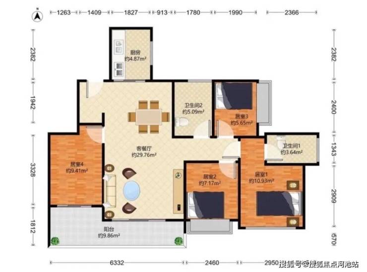 竖厅,4房2厅2卫,入户空间宽敞实用,客餐厅一体,阳台约11平,主卧套房设计。