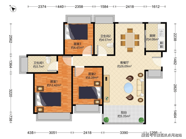 类似双龙抱珠户型,客餐厅一体,主卧套房设计,入户门厅空间可以做收纳。