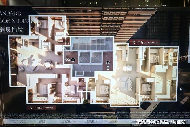 176-194㎡的主力户型则分布于1栋和2栋,均为2梯2户私密配置,层高达3.3米,对应近境典雅与召禾隐奢两种高端装修设计。
