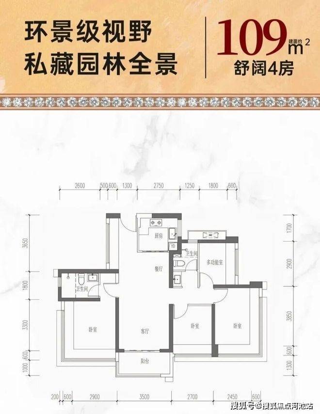 109㎡的4房2厅2卫,设计的是竖厅双龙抱珠格局,进门入户玄关,客厅3.5米开间,LDKB一体化,主卧270°无柱转角飘窗,分别做到了主卧15.45㎡/次卧13.57㎡/次卧9.31㎡/次卧6.96m²(包含墙体飘窗),U型厨房,公卫三段式干湿分离,得房率约74%(不含赠送),阳台西南朝向约5.95平。套内面积80.81㎡+赠送面积16.75㎡=实得面积97.56㎡,加上赠送后得房率约89.34%。