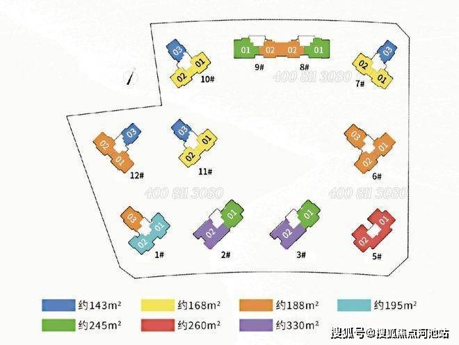 按照项目的过程版总图及户型图,可见项目有11栋(12个单元)楼,纯大户型,面积在140-168-190-253-332平。