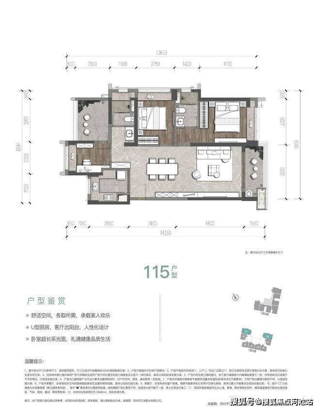 115㎡四房两厅两卫:420 万起,横厅设计搭配 6.8 米开间景观阳台,中厨 + 岛台配置,北向房间灵活改造,二胎家庭首选。