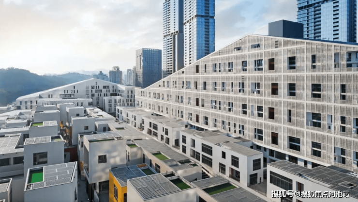 人们穿过喧闹的城市道路,乘扶梯上至屋顶平台,眼前豁然开朗,现出“屋舍俨然”的LOFT小镇。同时这片LOFT体块又是被周边的高大体量所包裹着的,围合出一片被隔离的“都市桃花源”。高低错落,空间变化丰富的小镇,让商业、办公与住宅人流在同一街区活动,创造了一种接待、办公、商业与文化空间融合的聚落式街道生活新模式。
