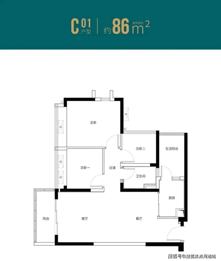 1H-01户型:约81㎡ 三房两厅两卫: