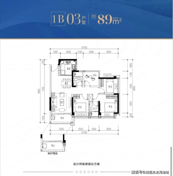 1B-03/05户型:约89㎡ 四房两厅两卫: