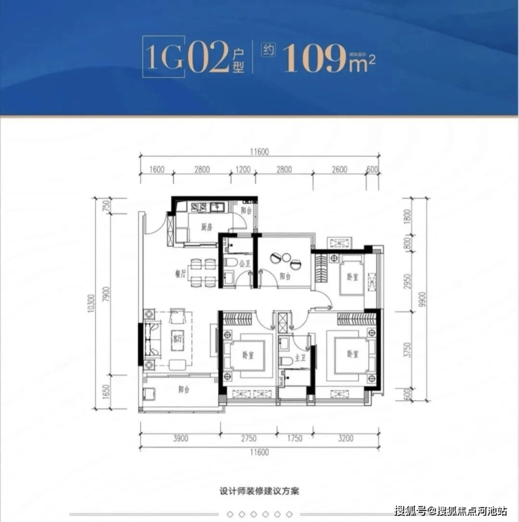 1G-02户型:约109㎡ 四房两厅两卫: