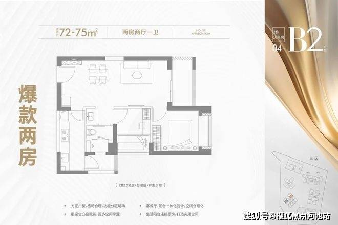 71-75㎡(两房一卫):本次主力户型,只分布在2栋;竖厅结构,朝向有东北、西南、东南;