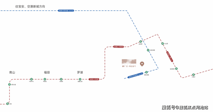 鹏广达湾区壹号项目位于二通道十几分钟到罗湖,地铁30分钟到万象城,近距离通达深港莲塘口岸、沙头角口岸,战略价值非常突出,项目拥有8号线、18号线(规划中)双地铁,目前8号线一期已开通,二期计划明年投入运营,北山道站(在建)与项目相距700米。