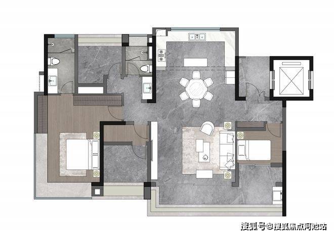 :LDKG世界会客厅设计,南北通透,中西双厨,双套房配置,主卧配270°转角飘窗、独立衣帽间与双台盆卫浴。