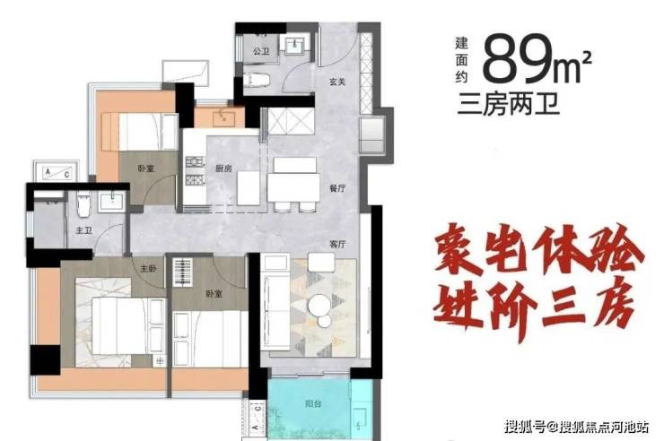 80㎡三房一卫(总价396万起)、89㎡三房两卫(439万起),小面积多房间设计,堪称刚需“神户型”