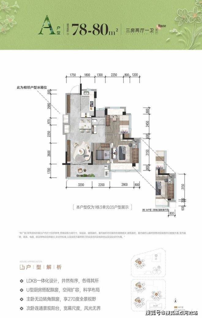 78-80㎡的3房2厅1卫,设计的是竖厅格局,客厅3.2米开间,LDKB一体化,S墙设计预留冰箱卡槽位,动静分区,主卧270无边转角飘窗,3个卧室分别做到了主卧16.62㎡/次卧9.27㎡/次卧5.72㎡(包含墙体飘窗),客厅连接次卧出5.4米长的大阳台,U型厨房,卫生间三段式分离,得房率约93-99%(包含赠送),西北朝向。