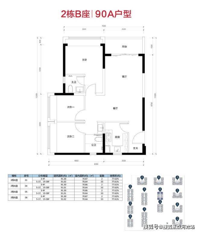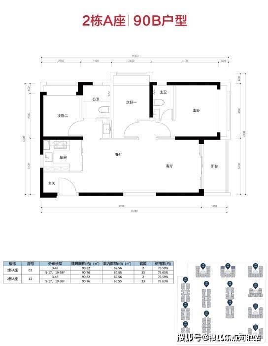 主要为90A/90B两种户型;均位于端头位,私密性较强,采光不错,且配多了一个卫生间;其中,
