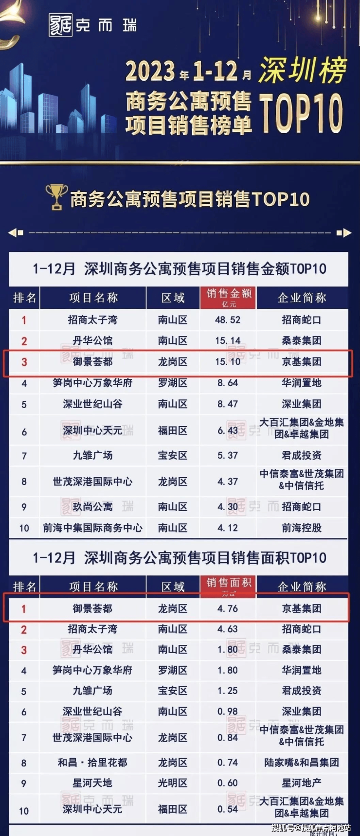 2023年1-12月深圳公寓共网签5577套、35.74万㎡。从各项目的网签量来看,2023年共40个公寓项目有网签成交,此外龙岗区御景荟都项目年度网签近千套。御景荟都凭借销售金额15.10亿元的成绩,荣登1-12月深圳商务公寓预售项目销售金额TOP3