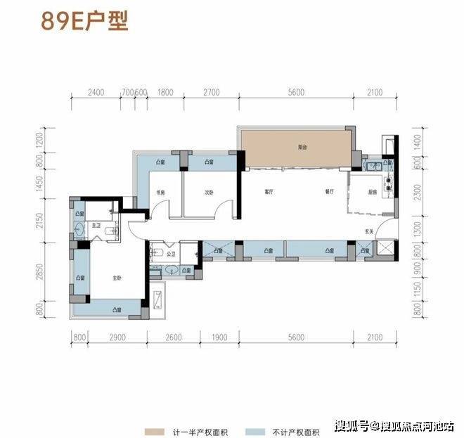 设计的是横厅南北通透格局,客餐厅5.6米开间,得房率约:96.4%,阳台主朝西北或东北向。看规划学校及规划养老院,视野开阔。