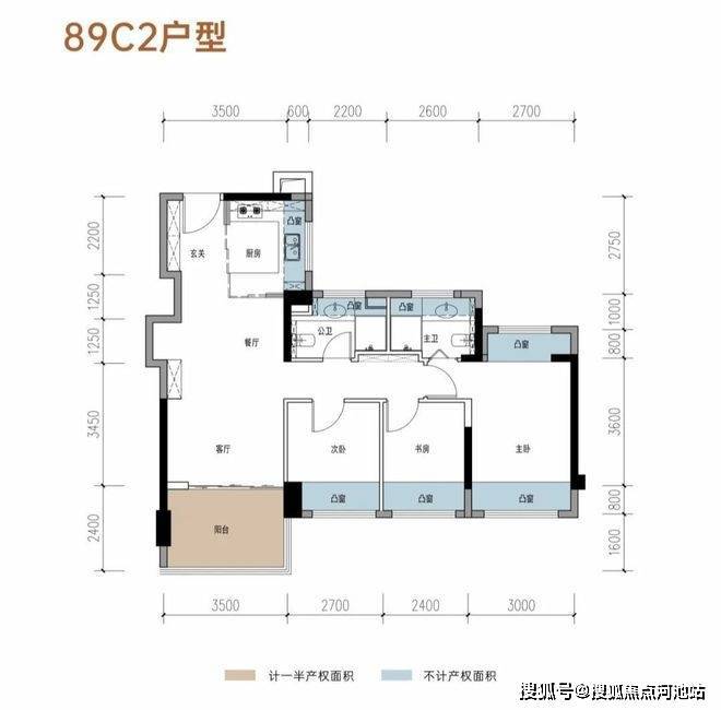建面约89㎡3房2卫