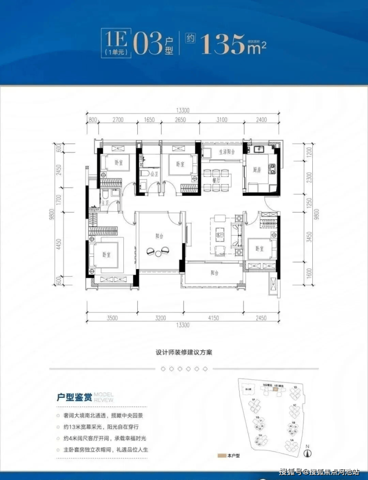 首推1栋B/G/H/E座,共333套,面积约81㎡3房2卫、89-109㎡4房2卫、135m²5房2卫,