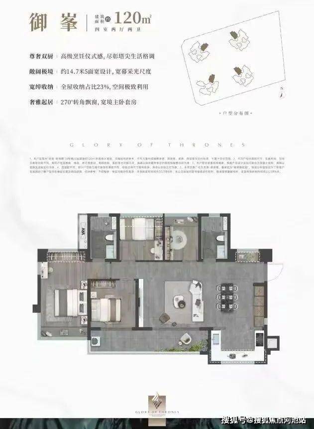 设计的是横厅南北通透格局,客餐厅开间8米,约14.7米超幕视野,超长阳台,主卧转角270°大飘窗,U型厨房,得房率:78.99%(不含赠送),阳台主朝西南或东南向。