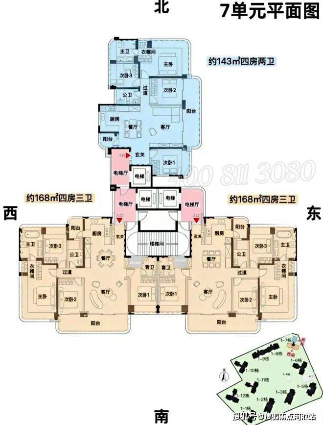 7单元:23层,3梯3户, 建面约143-168㎡