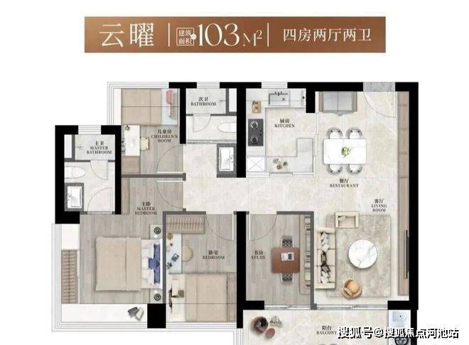 建面约103㎡3+1房2卫,则提供了更丰富的实用可能性。
