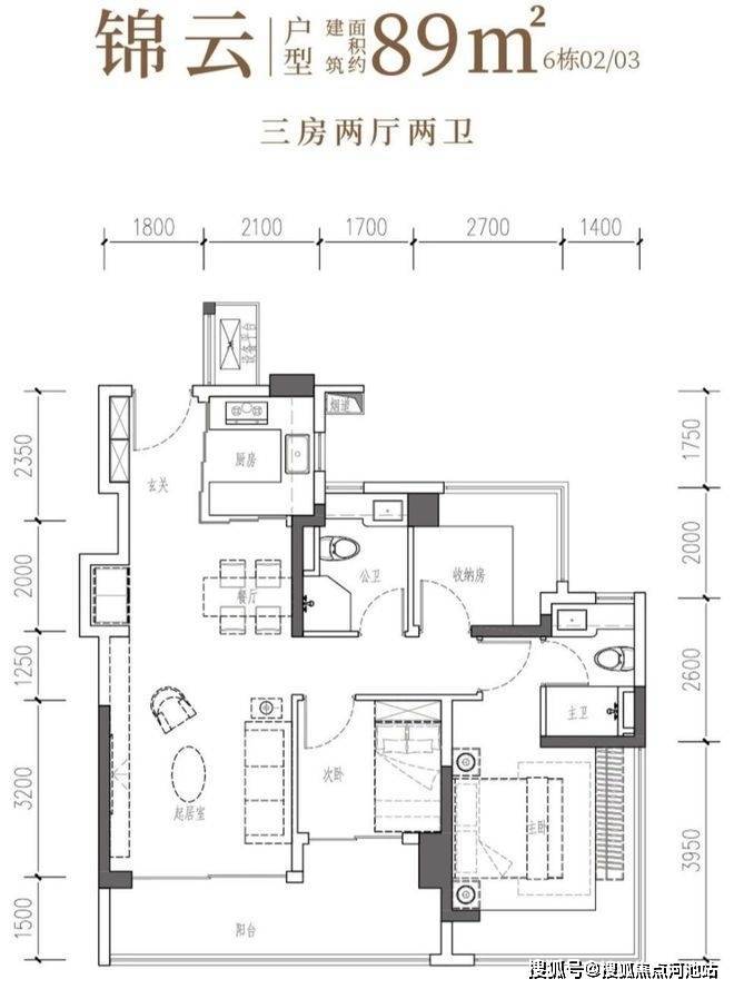89㎡的3房2厅2卫,6栋02/03户型,设计的是经典竖厅格局,客厅3.5米开间,LDKB一体化,S墙设计预留冰箱卡槽位,三开间朝南,动静分区,主卧+次卧270°无柱转角飘窗,分别做到了主卧15.25㎡/次卧7.56㎡/次卧6.48㎡(包含墙体飘窗),U型厨房烟道外置,卫生间干湿分离,得房率约97.47%(包含赠送),客厅连接次卧出大阳台约11.46平,西南或东南朝向。主要区别在于次卧跟主卫空间。