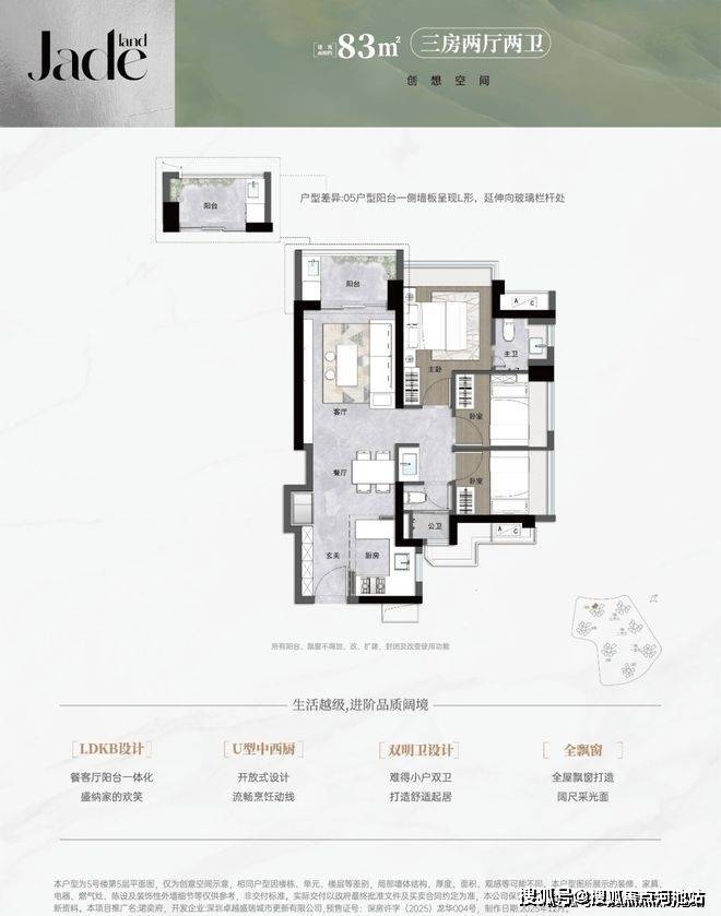 83㎡的3房2厅2卫,设计的是竖厅格局,进门入户玄关,客厅3.2米开间,LDKB一体化,S墙设计预留冰箱卡槽位,U型厨房,主卫少了淋浴,公卫三段式分离,得房率约90.33%(包含赠送),阳台西北朝向。